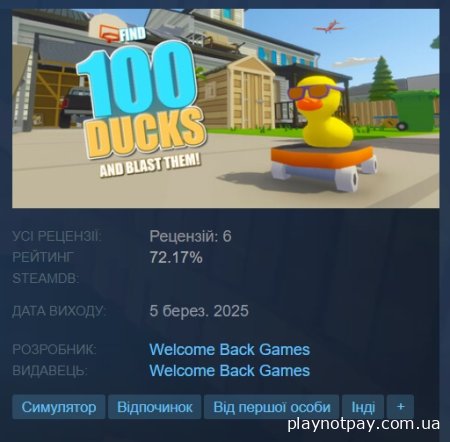 Так! У цій грі ви повинні знищити 100 іграшкових качок! Розслабтеся, прицільтесь і нехай пір'я летить! Невимушений геймплей та чарівні качки, на яких можна полювати, - це невимушена гра від першої особи, сповнена корисних сімейних розваг!