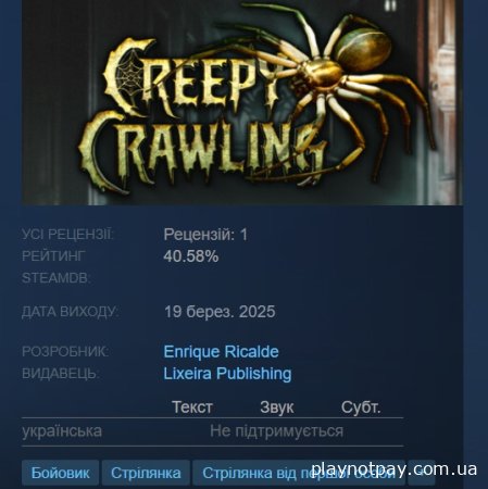 [Безкоштовно] Creepy Crawling 20/03/2025 09:37 playnotpay.com.ua У Steam вийшла нова безкоштовна гра Creepy Crawling Наш герой прокинувся в лікарні, але не може згадати нічого з того, що сталося напередодні. Йому потрібно знайти вихід, з'ясувавши, що ховається в тіні. Безкоштовно 0 + 0 - 0 110