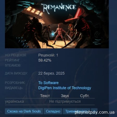 Souls-like від першої особи, який винагороджує гравців за оволодіння механікою бою на мечах. Повстаньте проти культу роботів, який знищив світ за допомогою наномашин, і помстіться кібернетичному володарю.