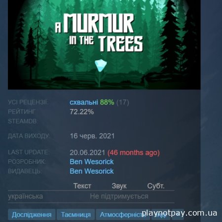 [Безкоштовно] A Murmur in the Trees 24/04/2025 10:14 playnotpay.com.ua У Steam назавжди безкоштовною стала гра A Murmur in the Trees Це коротка пригодницька гра-загадка в Америці часів сухого закону. Досліджуйте ліс у пошуках розгадки таємниці Самогонних вбивств. Безкоштовно 0 + 0 - 0 1130