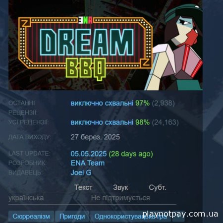 [Безкоштовно] ENA: Dream BBQ 02/06/2025 10:37 playnotpay.com.ua Безкоштовно у Steam ENA: Dream BBQ Випробуйте сюрреалістичне середовище та незрозумілих персонажів у ролі ENA у новому дикому світі. Безкоштовно 1 + 0 - 1 1349
