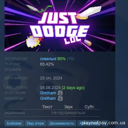 [Безкоштовно] Just Dodge, LOL 10/08/2025 18:13 playnotpay.com.ua У Steam назавжди безкоштовною стала гра Just Dodge, LOL Коли у вас немає ні зброї, ні магії, ні допомоги - просто ухиляйтеся. Пройдіть серію випробувань, щоб довести, що ви - гросмейстер ухиляння! Безкоштовно 0 + 0 - 0 1169