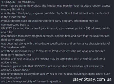 У випадку, якщо продукт виявляє таку несанкціоновану програму третьої сторони, інформація може бути передана UBISOFT, зокрема ім’я вашого облікового запису, адреса вашого інтернет-протоколу (IP), відомості про виявлену неавторизовану програму третьої сторони, а також час і дата, коли несанкціонована стороння програма була виявлена разом зі специфікаціями обладнання та характеристиками продуктивності Вашого обладнання.