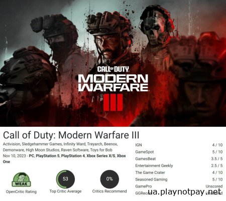 [Новини] У Call of Duty: Modern Warfare III на даний момент 53 бали зі 100 на OpenCritic. 08/11/2023 08:13 playnotpay.com.ua У Call of Duty: Modern Warfare III на даний момент 53 бали зі 100 на OpenCritic. 0% рекомендацій гри до покупки. Новини 0 + 0 - 0 10