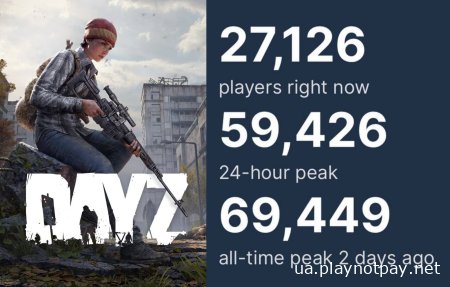 [Новини] DayZ побила рекорд онлайну в Steam - майже 70 тис активних гравців 14/11/2023 13:32 playnotpay.com.ua DayZ побила рекорд онлайну в Steam - майже 70 тис активних гравців Усе завдяки виходу великого патча 1.23, де виправили баги, поліпшили механіки і додали новий контент Новини 0 + 0 - 0 16