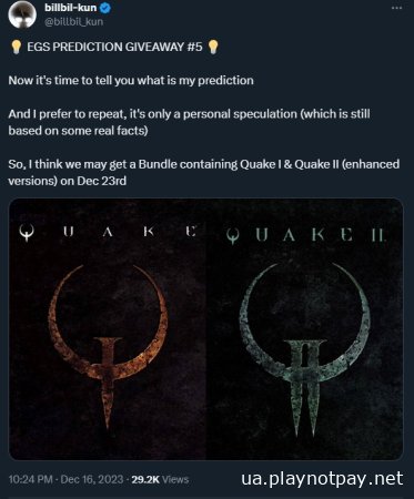 billbil-kun припускає, що п'ятою "таємною" грою в Epic Games, яка буде роздаватися 23 грудня, може стати набір, що складається з Quake I і Quake II.