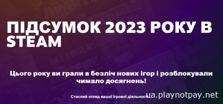 На цій сторінці ви знайдете детальну інформацію про ваші ігрові досягнення у 2023 році, таку як загальна кількість годин, проведених у грі, найбільш популярні жанри, улюблені ігри та багато іншого.