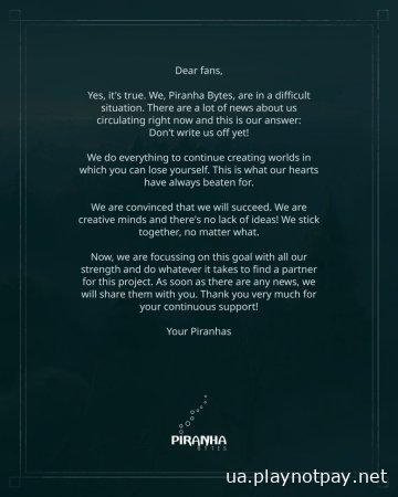 Незважаючи на цю складну ситуацію, представники Piranha Bytes закликають фанатів не списувати їхню студію з рахунків. Вони заявляють, що в даний момент активно працюють над наступним ігровим проєктом і шукають для нього нового видавця.