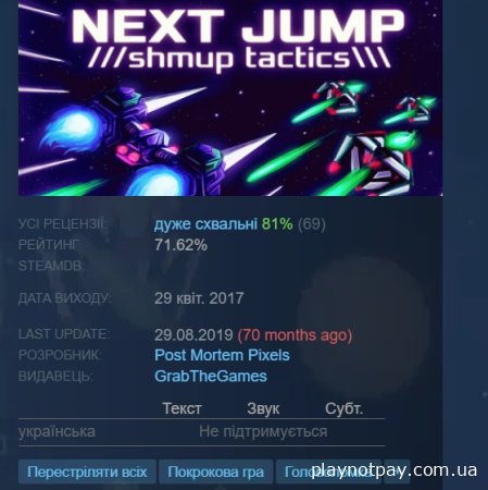 [Роздача у Steam] NEXT JUMP: Shmup Tactics 26/06/2025 20:03 playnotpay.com.ua Роздача у Steam NEXT JUMP: Shmup Tactics Це покрокова тактична стрілялка. Виконуйте космічні стрибки на процедурно генерованих майданчиках і переслідуйте злісних драконів, які вкрали всі запаси напоїв з Галактики! Роздача у Steam 0 + 0 - 0 1700