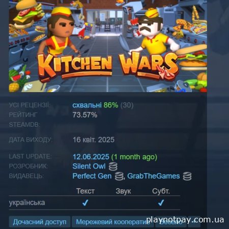[Роздача у Steam] Kitchen Wars 01/08/2025 20:13 playnotpay.com.ua Роздача у Steam Kitchen Wars Це швидка командна гра для 2-8 гравців, яка кидає їх у хаос ресторану, де вони повинні вести стратегічні бої та хитрі крадіжки, обслуговуючи своїх клієнтів. Роздача у Steam 1 + 0 - 0 1897